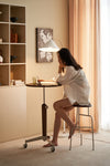 The Sundae Table is a height-adjustable lift table with universal wheels for easy movement. Perfect for compact spaces, it combines functionality with style. The chair features polished stainless steel and ash solid wood, adding an industrial design touch.